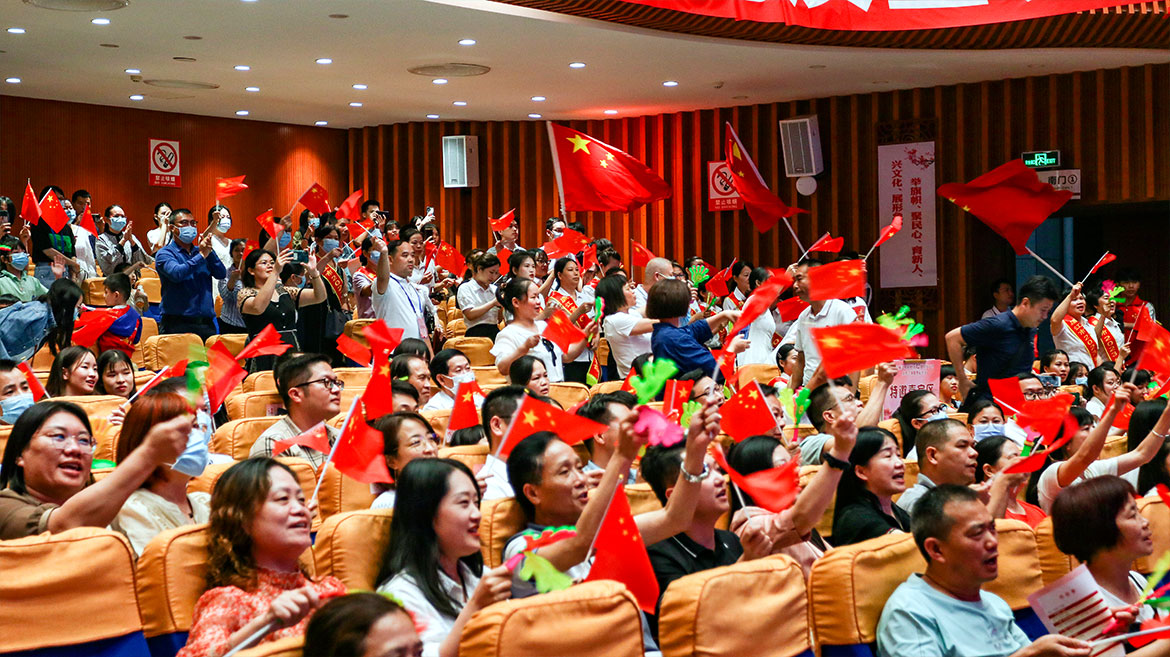現(xiàn)場(chǎng)觀眾揮舞著國(guó)旗一起高聲歌唱